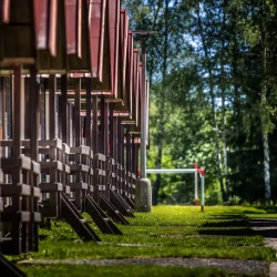 Vytápěné dvoulůžkové chatky, které nabízejí komfortní zázemí. K dispozici je moderní sociální zařízení, které zahrnuje odkládací skříňky, sprchové kouty, přebalovací pult a moderní vysoušeče s UV. Pro pohodlí hostů je připravena plně vybavená venkovní kuchyň.